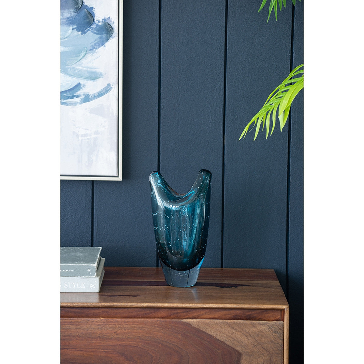 Elevate your home decor with our beautiful Blue Glass Vase. The stunning blue color will add a touch of elegance to any room. Display your favorite flowers or use as a statement piece on its own. Perfect for adding a pop of color and personality to your living space.