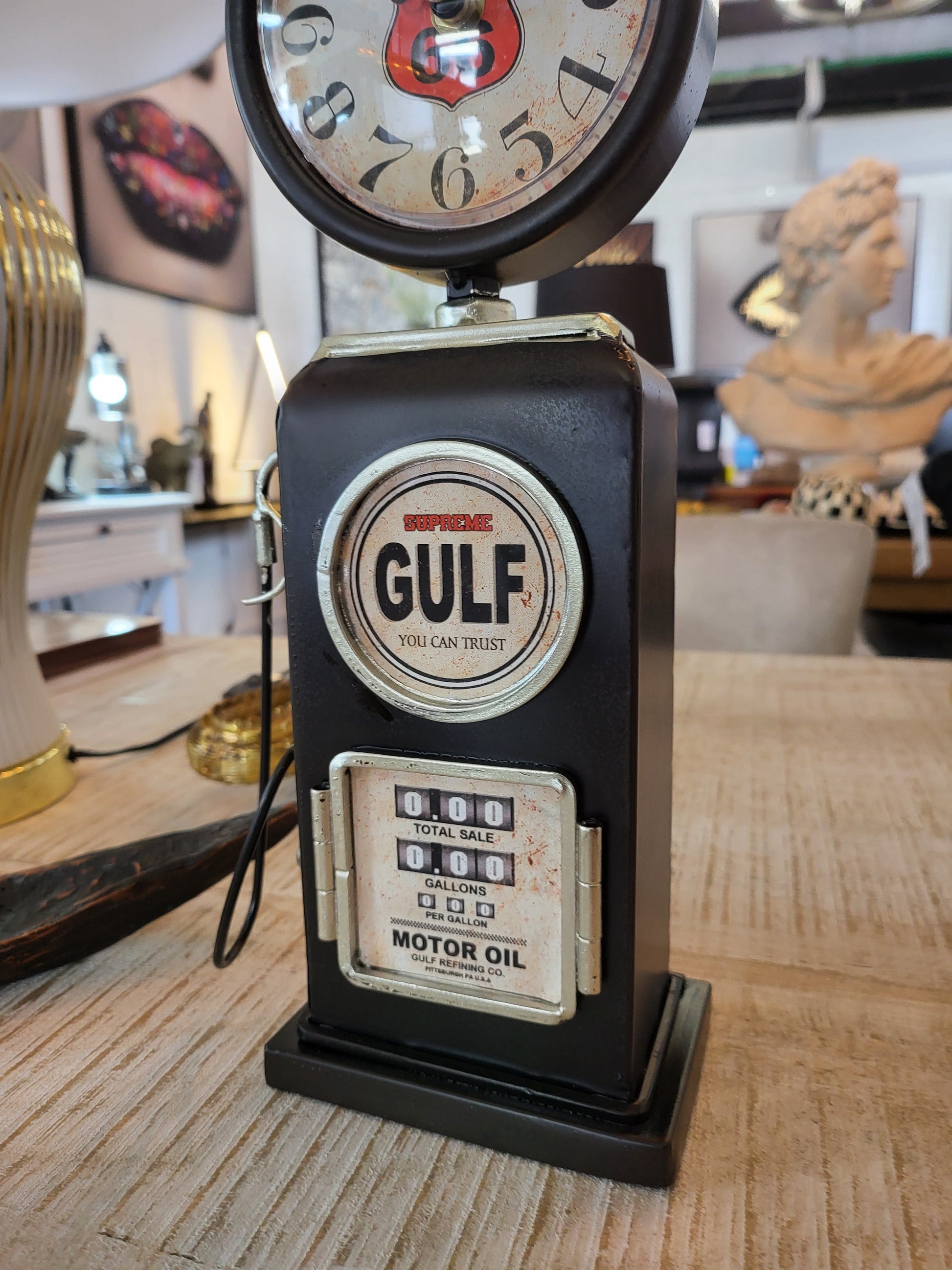 Bring a classic touch to your home with the Gulf Petrol Pump Table Clock. Crafted from durable metal, this captivating clock features a vintage black and antique white finish that adds a timeless look to any interior. Keep precise time and add a unique statement piece to your decor today.