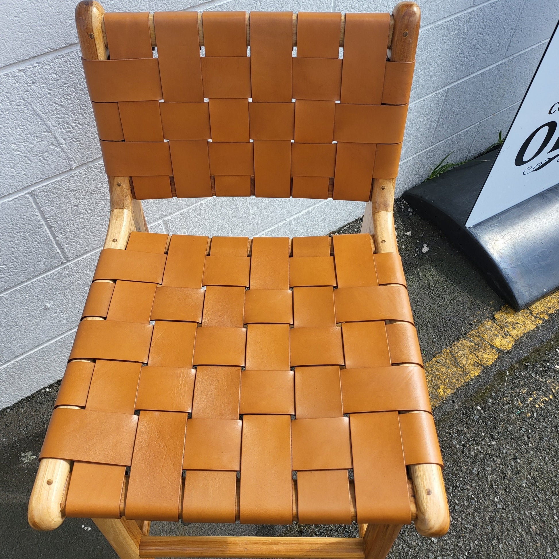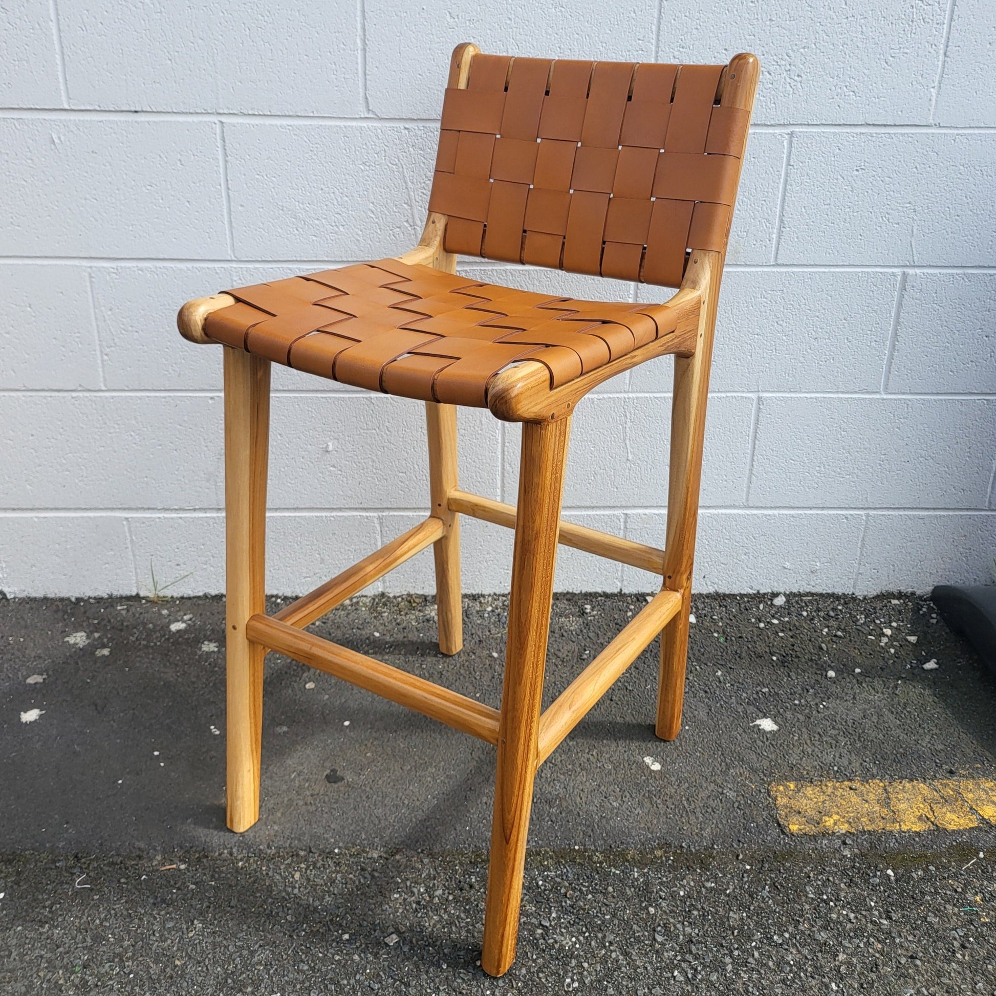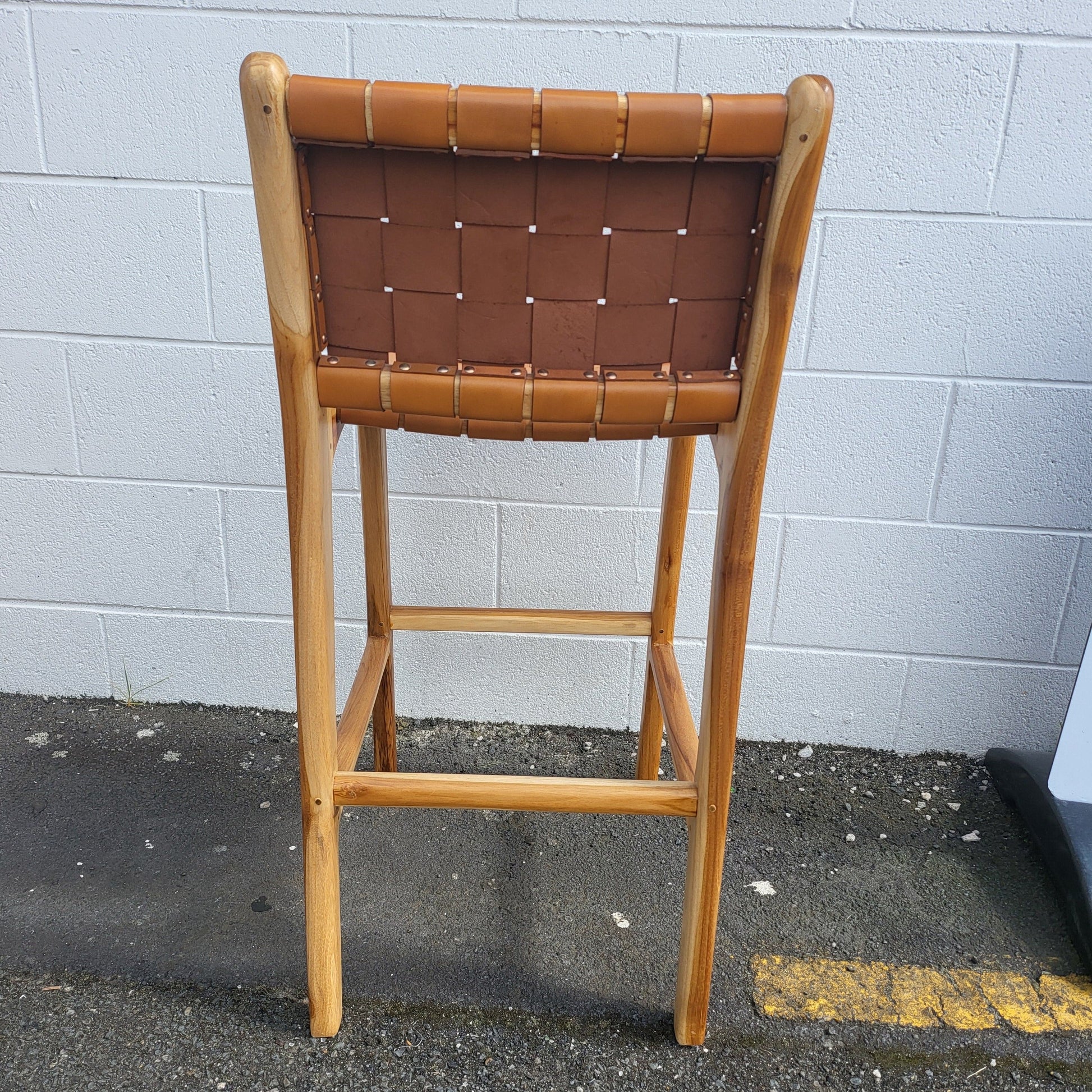 Elevate any dining experience with this deluxe contemporary woven leather bar stool. A modern interpretation of the pub classic, it's finely crafted with Teak wood that features a natural wood finish and timeless cognac leather. A design investment.