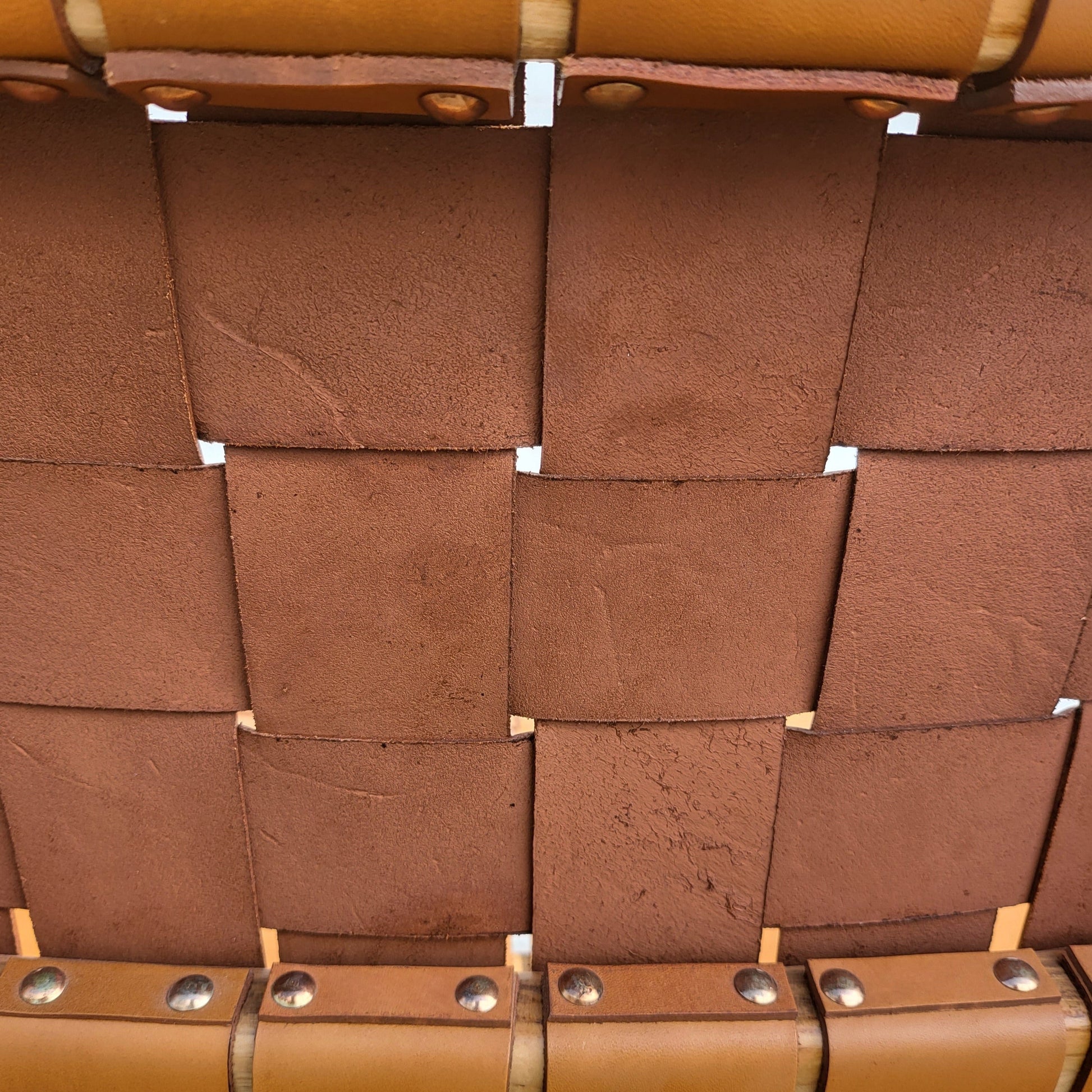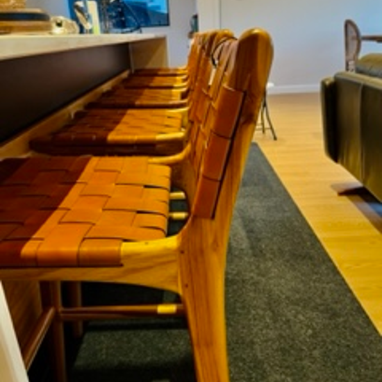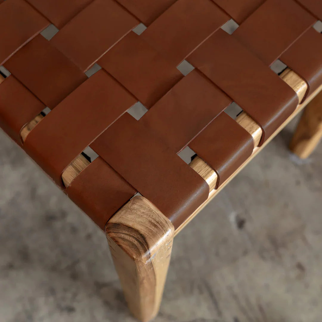 Elevate any dining experience with this deluxe contemporary woven leather bar stool. A modern interpretation of the pub classic, it's finely crafted with Teak wood that features a natural wood finish and timeless cognac leather. A design investment.