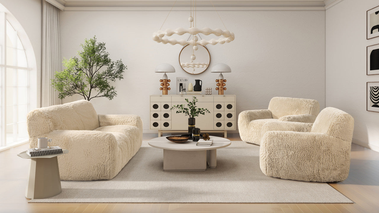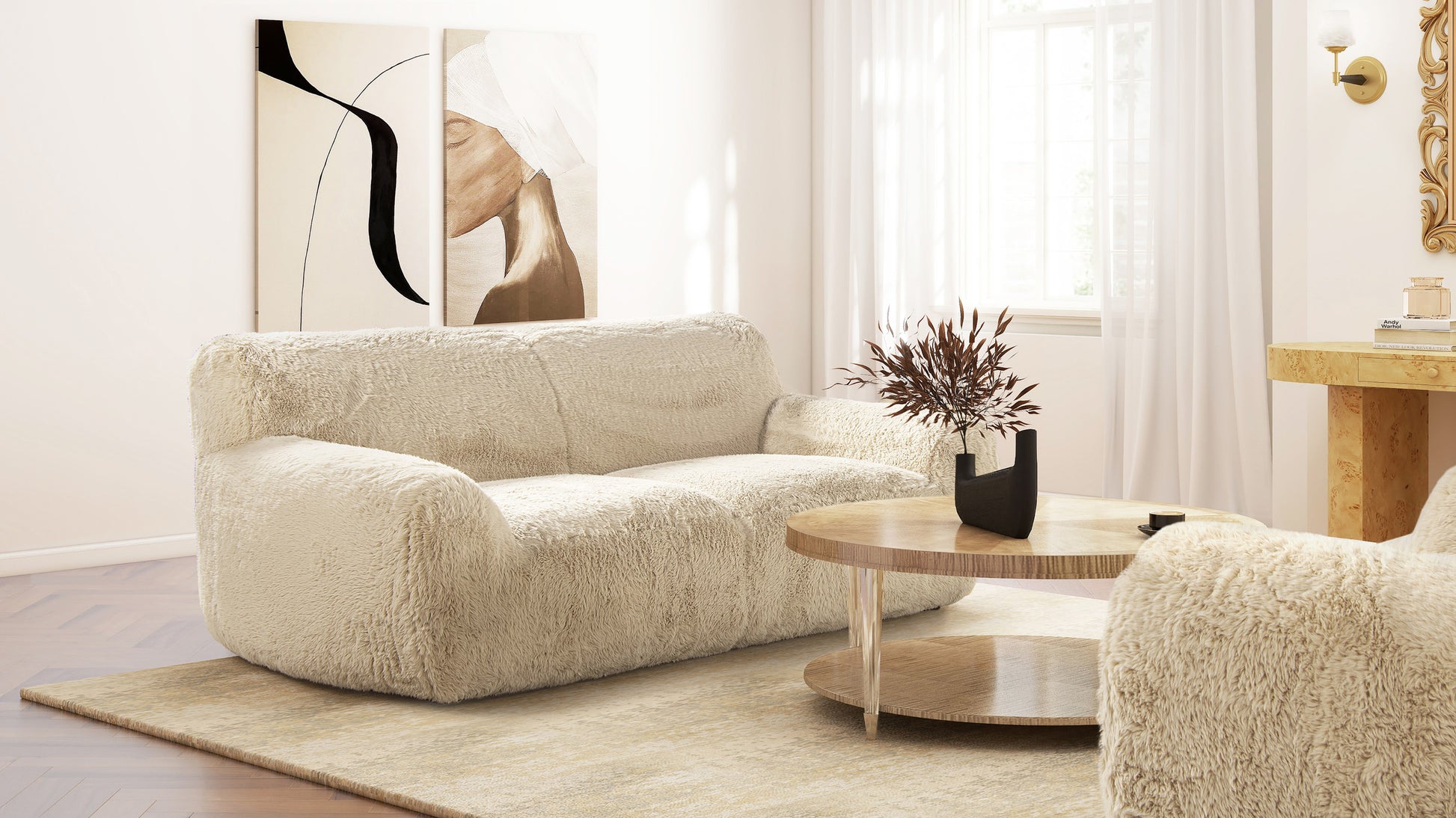 Immerse yourself in the sumptuous softness of the Cabana Faux Sheepskin Seating. The faux Mongolian Sherpa fur is beautifully dyed in a subtle neutral beige hue for a touch of warmth to your modern living space. The oversized silhouette with multilayered medium-firm foam seat and rounded arm will surely provide an ultimately comfortable lounging experience.