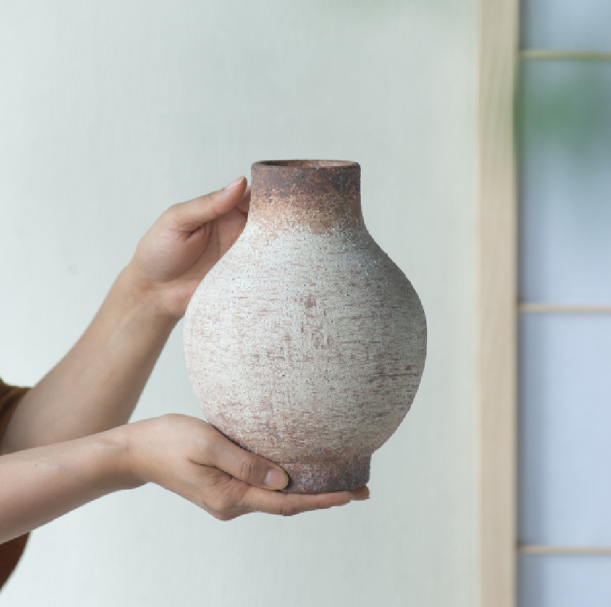 This terracotta planter has a rust and antique white finish, creating a stylishly understated look. The terracotta is durable yet lightweight, making it ideal for gardens large and small. Its classic design with modern accents makes it a timeless piece suitable for any outdoor space.