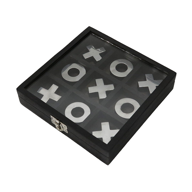 Step up your classic game of Tic Tac Toe with this stylish box. Featuring a mix of beautiful mango wood, sleek aluminum, and a clear glass top, this 18cm box adds a touch of chic to any setting. Play and display with ease!