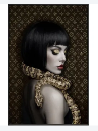 Introducing the Yves Saint Laurent Woman W/ Snake wall canvas, measuring 120X80CM, beautifully framed in sleek black. Adorn your home with this exclusive and sophisticated piece, featuring a striking snake design that embodies luxury and elegance. Elevate your decor with this stunning work of art.